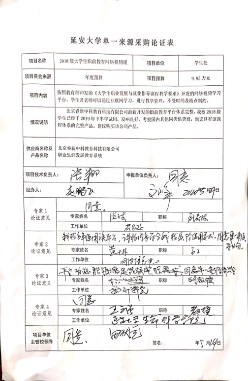 延安大学职前教育网络视频课采购项目拟采购职业生涯发展教育系统。拟采取单一来源采购方式采购,由北京睿新中科教育科技有限公司提供。现将有关情况向潜在供应商广泛征求意见。征求意见期限从2020年6月4日起至2020年6月10日止。