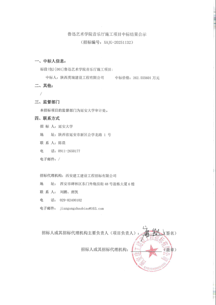 鲁迅艺术学院音乐厅施工项目中标结果公示 2026年01月13日 17:07 点击:[] 下一条:关于延安大学网上报告厅资源扩充及平台维保服务项目的废标公告 【关闭】